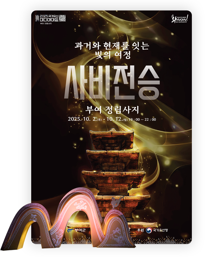 국가유산 미디어아트 부여는 부여 백제역사유적지구의 소중한 가치를 알리며, 백제의 찬란한 역사와 문화를 빛으로 표현한 몰입형 미디어아트입니다. 오직 부여에서만 만날 수 있는 독창적인 미디어아트로 사비 백제의 문화를 빛으로 새롭게 풀어내어 과거와 현재, 그리고 미래를 잇는 깊은 감동을 경험하시길 바랍니다.